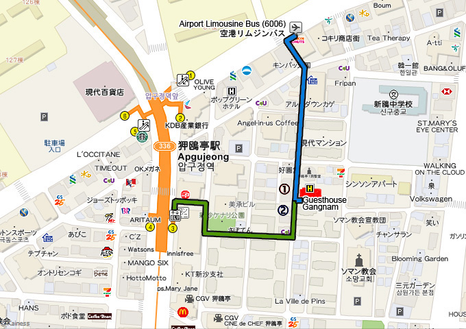 It's only 3min walk away from the Airport Limousine Bus Stop(#6006, from Incheon Int. Airport), and also 3min walk away from Apgujeong subway station(Exit gate no. 3). |
