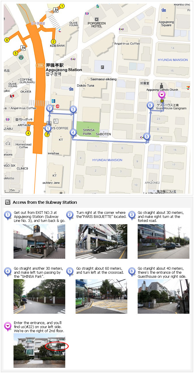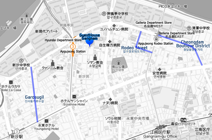 Guesthouse Gangnam is located between Garosugil and Apgujeong Rodeo Street, 10 min walk away from each. Address: 22-202, Shinsa-dong 607-9, Gangnam-gu, Seoul, Korea (33 Apgujeong-ro 34 gil) |